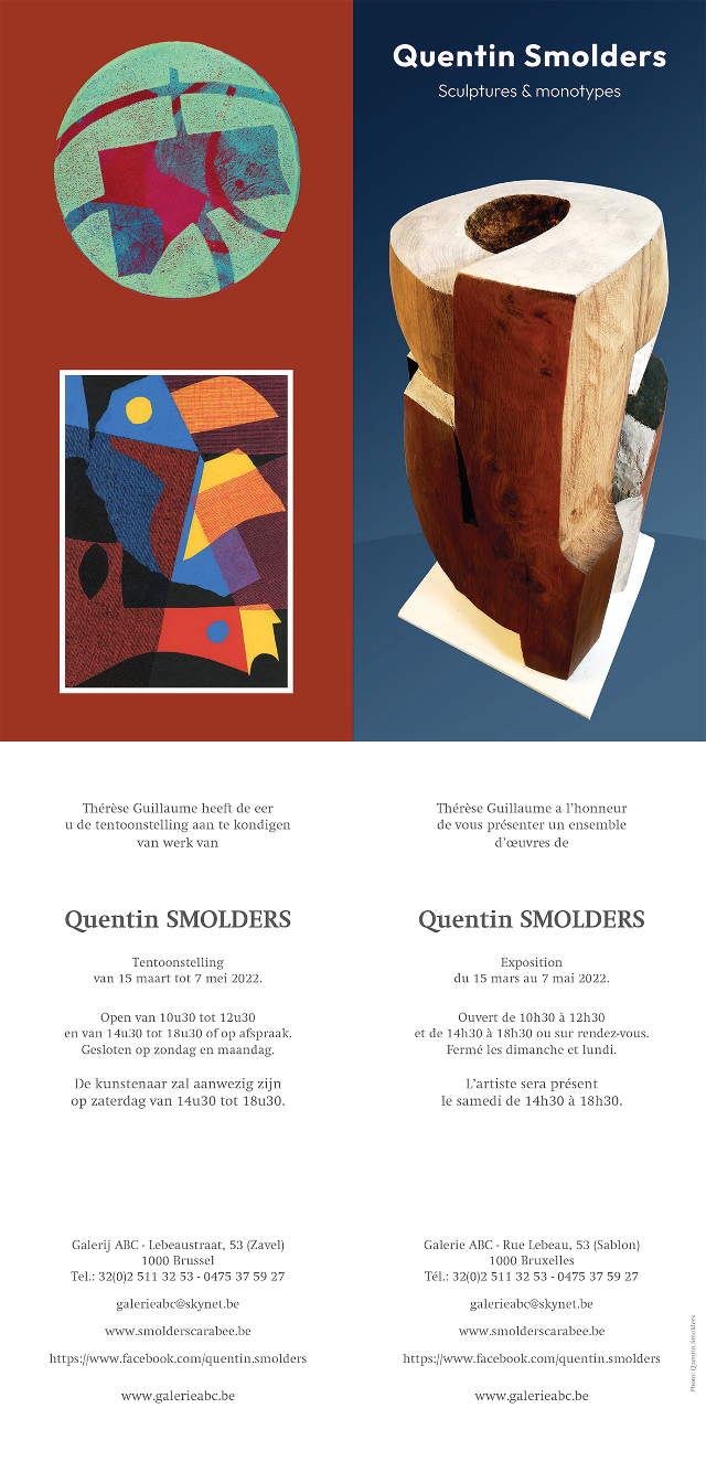 Quentin Smolders nous revient avec une série étonnante de collages façonnés de papier japon peint à la main. Les formes colorées et acidulées s’inscrivent avec légèreté dans des architectures imaginaires. La fragilité de la déchirure se mêle avec brio à la construction de formes découpées aux ciseaux. Serrures, points de ponctuation, fenêtres obliques, formes naturelles, petits symboles dansent dans des compositions très contrôlées. Un autre aspect de son travail est à voir dans ses gravures sur bois dont les noirs rythment des espaces aux perspectives décalées. Des silhouettes aux formes carrées se glissent dans des miroirs à facettes multiples. Les couleurs franches en aplat au pochoir donnent une fraicheur printanière et équilibrent parfaitement les grands traits de noirs profonds des gravures. Quentin Smolders nous livre également des sculptures sur pierre. Travaillées avec lenteur afin de faire surgir des formes enfouies au cœur de la matière. De grandes masses épurées s’emboitent et donnent un aspect de force et de mouvement à la pesanteur de la matière. Le travail des surfaces à la gradine fait vibrer la lumière. Des peintures acryliques de grands et moyens formats créent un lien entre le travail de collage, de sculpture et de gravure. C’est un ensemble complet d’œuvres en deux et trois dimensions qui dialoguent et donnent à voir un univers particulier et imaginaire.